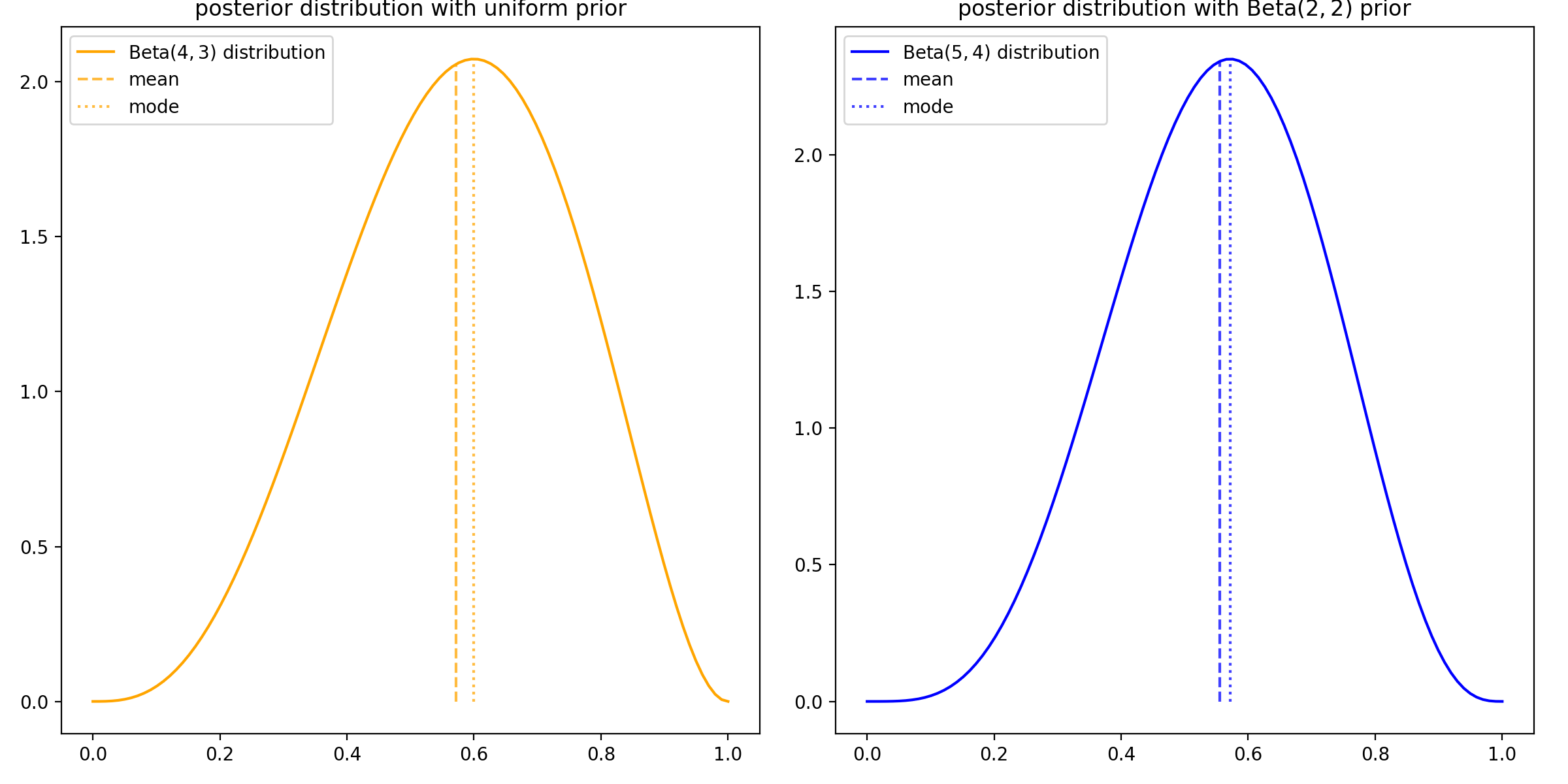 Moreover, for \(\alpha = \beta = 1\) the prior distribution equals a uniform distribution and hence, the MAP estimate yields the MLE value for \(\hat{\theta}\). As seen before, in this example \(\hat{\theta}\) equals also the probability for heads, since it is the parameter of a Bernoulli distribution. In Bayesian Inference, we have seen that the full Bayesian inference and use of the posterior predictive distribution yields that the probability for heads equals the expectation of the beta distribution which differs from its mode. Indeed, it holds