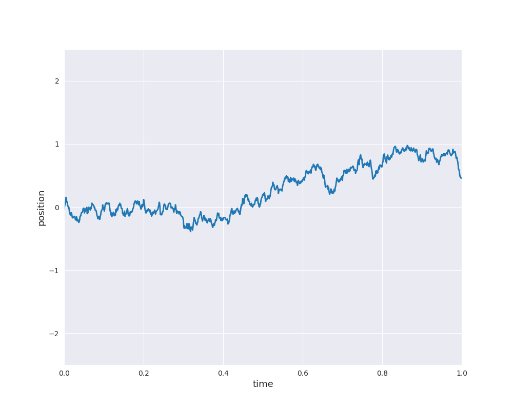 Please note that the 2d simulation shows the current position of some particle as well as its previous path. In one dimension, we can easily simulate sample paths of Brownian motion starting at \(X_0 =0\) and plot the result as position against time: