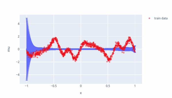 As the training goes on, some inducing points are moved outside of the training boundaries and their values are set to mean (\(0\)) which relating to a small variance where we do not have any datapoints. To avoid such a behavior, we can set “whiten = True” the SVGP, which a variable transformation and should not effect the model.